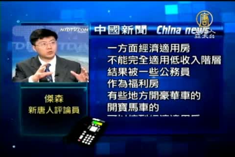 新唐人評論員 傑森:「一方面經濟適用房不能完全適用低收入階層,結果被一些公務員作為福利房,有些地方開豪華車的 、開寶馬車的可以搞到經濟適用房,更關鍵的問題,各地地方政府沒有熱情去做這個事,因為經濟適用房他們賺到的錢很少,而且對他們真正賺錢的行業,比如說商 品房,他有個抑制作用。」
