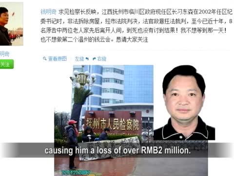 事發前,錢明奇通過微博透露,前江西省撫州市臨川區紀委書記習東森非法徵地,給他造成200多萬元經濟損失,十年來,錢明奇向多方訴求,至今沒有結果!在他與現任區長習東森的通話錄音中,錢明奇表示,已經沒路走了!
