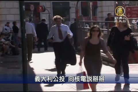 【新唐人亞太台2011年6月14日訊】鏡頭焦點轉到歐洲的義大利,義大利舉行包含是否放棄核電在內的4項議題的公投,14號結果出爐,所有政府的政策都遭到超過9成民眾反對,總理貝魯斯科尼遭到重創,其中94%的選民反對核能發電。