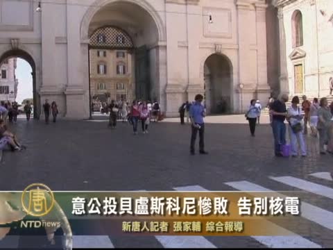 【新唐人2011年6月14日訊】意大利舉行包含是否放棄核電在內的4項公投議題,結果所有政府的政策都遭到超過9成選民反對,總理貝盧斯科尼承認在這次公投中慘敗,其中94%的選民反對核能發電。星期二,羅馬民眾一覺醒來,高興的迎接公投的勝利。