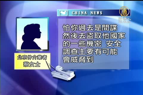 北京仲介業者 蔡女士: 「怕你過去是間諜,然後去盜取他國家的一些機密。安全調查主要有可能會威脅到他們國家的資訊安全等方面。比如說他之前在中國情報局工作,或者高科技,國家的科研所之類的工作。」