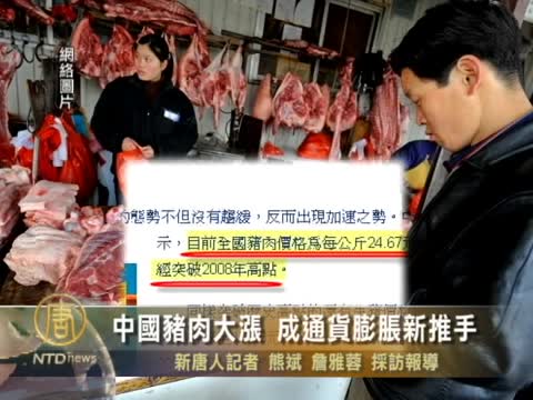 【新唐人2011年6月18日訊】中國豬肉價格大漲,同比漲幅高達75%。分析師認為,豬肉價格飆漲,可能成為通貨膨脹新推手。大陸養豬戶認為,去年養豬賠錢,今年養的少,加上其他物價上揚,帶動養豬成本上漲,造成豬肉價大漲。