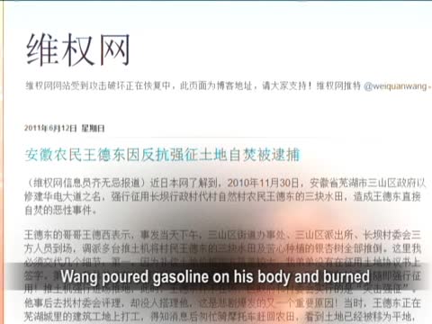 中國各地因抗議強制拆遷的自焚事件層出不窮。去年1月在江蘇鹽城市、3月在連雲港市,分別發生自焚抗拆事件。去年4月,無錫市濱湖區居民虞炳英,和無錫市南長區老黨員姚耕,先後自焚抗拆。
