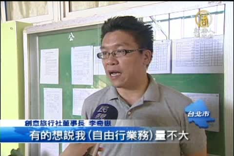 【新唐人亞太台2011年6月20日訊】中國客來台自由行即將上路,之前一度因為旅行社被要求擔保中國客行蹤引發反彈,移民署最新的規定出爐,改成旅行社可以選擇罰款10萬元,或者停辦自由行送件業務,雖然出現轉圜空間,但還是有業者認為,自由行利潤微薄,10萬元罰款太高。
