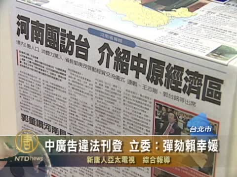 【新唐人2011年6月20日訊】中國來台灣招商或招攬旅遊的廣告,越來越多,民進黨立委發現,最近只要有中國官員來臺,就有部分媒體配合刊登招商或招攬旅遊的廣告,已經違反兩岸人民關係條例,但陸委會卻坐視不理,民進黨立委要求監察院,彈劾纍犯陸委會主委賴幸媛。