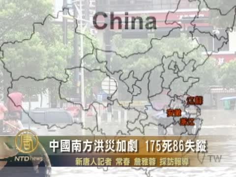 【新唐人2011年6月21日訊】中國南方正經歷超過半世紀以來最嚴重洪災的侵襲。根據中共民政部統計,截至6月20號下午,中國南方因為近期洪澇已造成175人死亡86人失蹤,經濟損失超過350億﹔另外在新疆、甘肅也罕見的出現暴雨災情。中央氣象臺預報,南方各地在未來幾天還會持續降雨。