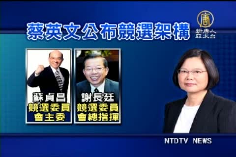 【新唐人亞太台2011年6月22日訊】民進黨主席蔡英文今天(22日)公布2012大選競選組織與架構。下午舉行「出發,2012」記者會。經過1個多月的諮詢、請益,行政院前院長蘇貞昌擔任競選委員會主委、謝長廷擔任競選委員會總指揮,游錫堃擔任競選委員會總督導與財委會主委。在19日馬英九陣營公布副手人選三天之後, 蔡英文團隊也正式向媒體公布競選團隊架構,宣示民進黨投入總統大選正式起跑。