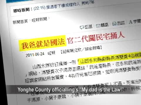 【新唐人2011年6月25日訊】河北大學的“官二代”李啟銘醉駕撞死人之後,高喊一聲:“我爸是李剛”,震驚海內外。最近,在山西永和縣又出現一升級版的“我爸是李剛”,打人者叫囂的是:“我爸是縣長,我爸就是國法。”中國“官二代”的蠻橫,再次讓網民義憤填膺。