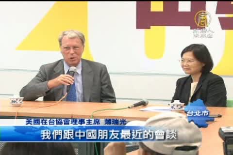 【新唐人亞太台2011年6月27日訊】總統大選逼近,各界關注台美軍售議題,美國在台協會主席薄瑞光,今天拜會民進黨主席蔡英文和立法院長王金平,薄瑞光說,對台灣的軍售會持續進行,不過美國是否會售台F-16C/D戰機?薄瑞光沒有正面回應,強調此行是聽取各方意見,沒有替華府傳遞訊息。