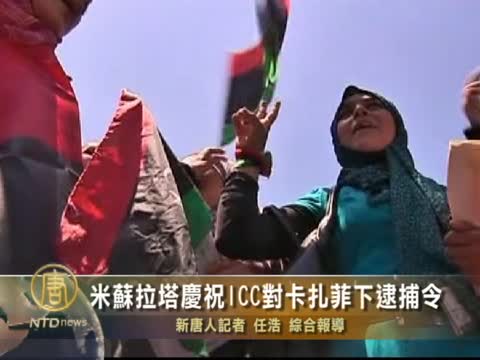 【新唐人2011年6月28日訊】星期一(6月27號),利比亞城市米蘇拉塔,充滿節日的氣氛,數百居民湧上街頭,慶祝國際刑事法院,當天下達了對卡扎菲等三人的逮捕令。