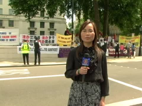 今天是6月27日,也是溫家寶訪問英國的最後一天。在唐寧街10號首相府的對面,來自英國的人權團體,包括自由西藏運動,民運人士,和法輪功團體,在這裡舉行了抗議活動。