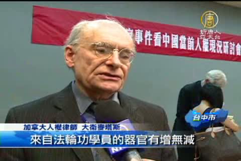 【新唐人亞太台2011年6月29日訊】帶著新出版的中文版《血腥的活摘器官》的作者大衛‧麥塔斯與大衛‧喬高第三度來到台灣,向台灣各界揭露中共血腥摘除法輪功學員器官的真相,28日出席了中興大學「從活摘器官事件看中國當前的人權現況」研討會。中部醫界、法官與多位學者及民意代表出席與談。