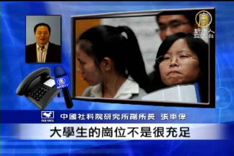 中國社會科學院人口與勞動經濟研究所副所長 張車偉:「現在就業壓力確實很大,今年畢業的有600多萬大學生,數量是越來越大,大學生所學的知識,和社會的需求相比還不是完全一致。再一個我們的社會生產的領域擴張比較快,第三產業(服務業)發達不是很好,所以適合大學生的崗位不是很充足。」