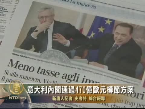 【新唐人2011年7月1日訊】意大利內閣通過樽節方案,目標在未來四年內減少470億歐元(680億美元)的支出,並安撫金融市場和歐盟夥伴,讓他們對意大利整頓財務的承諾放心。民眾對這項緊縮方案則表達了不同的看法。