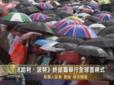 【新唐人2011年7月8日訊】7月7號,哈利•波特系列影片的終結篇《哈利•波特與死亡聖器2》在倫敦舉行全球首映式。作家羅琳和幾位主角明星們在特拉法加廣場和來自世界各地的哈利波特影迷們見面。儘管當天下起瓢潑大雨,但糟糕的天氣並沒有影響影迷們的熱情。