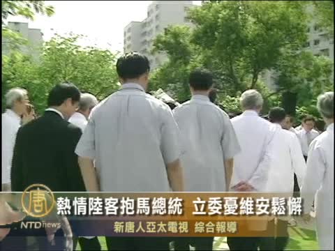 【新唐人2011年7月8日訊】總統馬英九前一天在國父紀念館,巧遇熱情陸客,不但照相,還伸手勾住馬總統的脖子,讓朝野立委看了很緊張,這也讓馬總統在8號的公開行程,被K的隨扈很緊張,寸步不離。