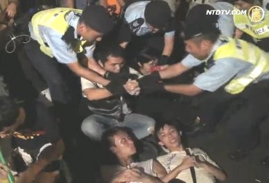 7月1日晚11時後,新唐人實習女攝影記者蔡小姐前往中環示威現場採訪期間,遭到警方強行拘捕。蔡小姐表示,抵達現場時,警方已封鎖了示威現場,但有警員主動讓她進入封鎖線內拍攝。