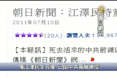 【新唐人亞太台2011年7月10日訊】據日本《朝日新聞》網站引述多個消息來源表示,江澤民已呈彌留狀態,僅靠生命維持器苟延殘喘,此刻的生死大權既非操控在他本人、亦非其家屬,而在中共高層。中共中央政治局9名常委之一的賀國強仍在國外,等他返國後,北京當局就會正式公布江澤民的生死情況。另外,香港評論家林和立也表示,《朝日新聞》的消息相當可靠,因為中國內地的多名編輯已接到命令,準備製作江澤民的紀念專輯。
