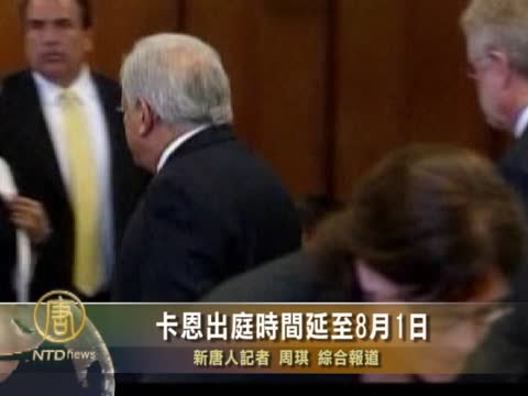 【新唐人2011年7月13日訊】國際貨幣基金組織(IMF)前總裁卡恩性侵案再現波折,距離原定的開庭日期7月18日還有一週,卡恩的律師和紐約檢察官宣佈,將庭審時間推遲到8月1日。