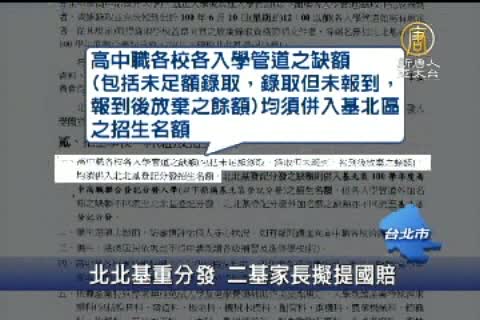 【新唐人亞太台2011年7月14日訊】北北基聯測爭議不斷延燒,北市府針對高分低就學生,做出改分發補救,但是又造成二次基測考生和家長抗議,揚言要告北市府及聲請國賠。