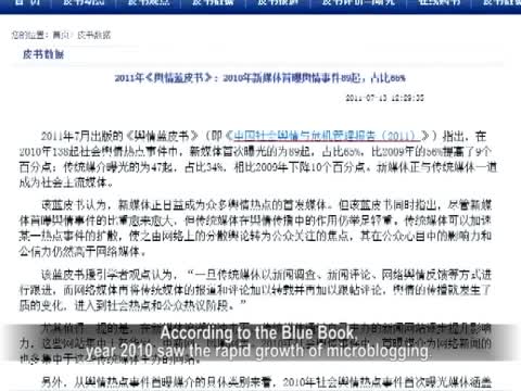 《藍皮書》數據顯示,去年是「微博」的急速成長之年,2010年138起社會輿情熱點事件中,「微博」首次曝光的事件為22起,比重約由2009年的0%上升為16%。並且,2010年大部分社會輿情事件中都有「微博」的介入。