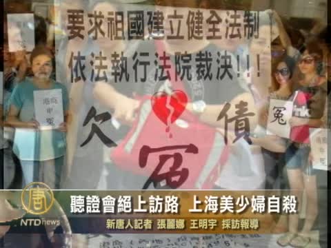 【新唐人2011年7月15日訊】上海一名28歲的少婦的住房被強徵偷拆後多年上訪得不到解決。上個月,當地虹口區信訪辦以聽證會方式裁決宣佈不予賠償,她因此感到絕望而自殺身亡。15號,她的丈夫向本臺記者表示,聽證會的決定和她的妻子自殺有絕對關係。