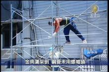 2011-07-17 21:15:18台中金典酒店鷹架倒塌,造成12位民眾受傷,其中婦人曾美惠傷勢最嚴重,目前還沒有脫離險境,傷患的丈夫哀求「像搶救邵曉鈴,救救我太太」,至於倒塌原因,除了風太大,警方也找到部份鋼管間,雖然有用螺絲釘,但是卻沒有用螺帽鎖住,只用鐵線固定,懷疑施工工法有瑕疵。