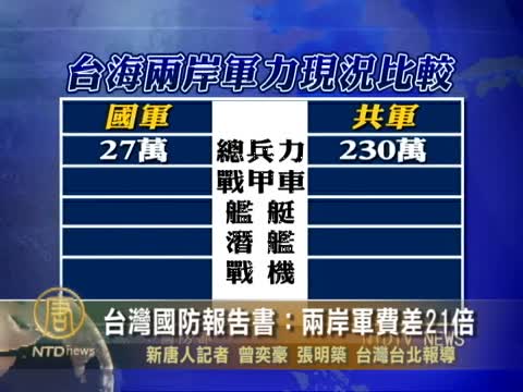 【新唐人2011年7月20日訊】中華民國國防部19號公布民國100年國防報告書,內容明確將臺海兩岸軍力現況列表比較,共軍目前的總兵力約為230萬多人,國軍只有27萬多人,兵力相差近十倍。國防預算最多更是相差了近21倍。國防部副部長楊念祖表示,僅管政府積極推動海峽兩岸和平穩定,但是國防安全,絕不放鬆。