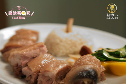 7.放入電鍋煮熟後,盛飯擺盤,放上雞肉、涼拌小黃瓜、嫩薑即完成。