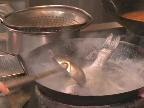 白色配料與紅色調料,在鍋內不停拌炒,加入高湯調味後,就先到一旁的瓦斯爐上,繼續沸騰,這時,一整尾的鱸魚準備入水汆燙,大約八分熟後撈起,再放回鍋內悶煮。