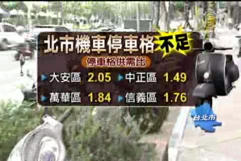 民眾抱怨台北市實施機車退出騎樓後,要停機車真的難上加難,也難怪大家的機車停得亂七八糟。不但有直的也有停橫的、甚至不把停車格放在眼裡,而根據停管處調查,全市12個行政區的停車需求,結果大安區的機車停車位比實際需求少了一半,等於兩部機車要搶一個車位,而中正區、萬華區和信義區的供需失衡比例也很驚人。