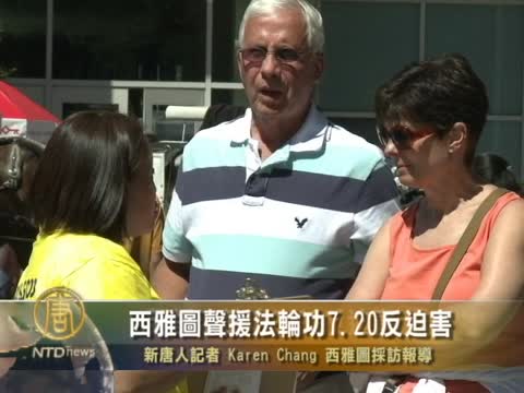 【新唐人2011年7月25日訊】從7月20日之前直至現今,全球各地的法輪功學員持續以和平理性的集會或和平煉功的形式,向人們訴說法輪功被迫害的真相,呼籲更多人挺身而出,共同制止長達12年的迫害,下面請看來自西雅圖的報導。