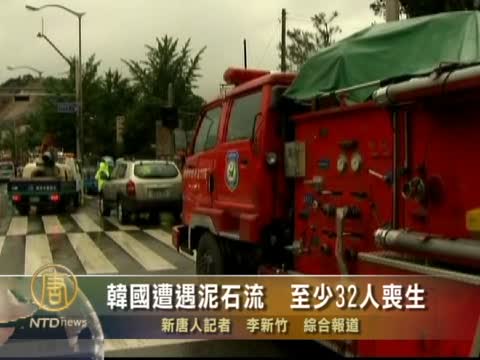 【新唐人2011年7月28日訊】自週二下午開始,韓國中部地區遭遇罕見的暴雨襲擊,部分地區因此而引發泥石流。截至週三(7月27號),至少32人在這次水災中喪生,另有24人受傷。多處房屋田野被水淹沒。