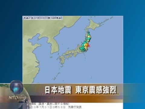【新唐人2011年7月31日訊】當地時間7月31日(星期天)凌晨03時53分,日本東北部福島縣岩木市(IWAKI)周邊發生地震,日本氣象廳初步推測震級為裡氏6.4級,震源在40公里。同時在宮城縣也錄得約3級地震。同時東京地區震感強烈,時間約為三分鐘。