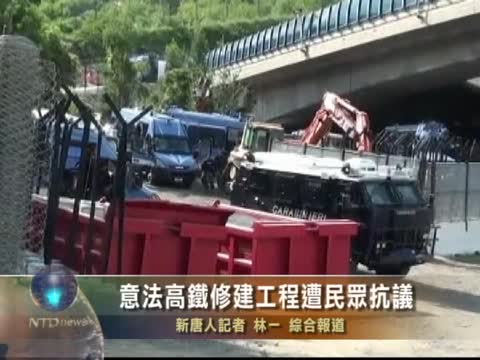 【新唐人2011年8月1日訊】幾千民眾7月30號在意大利北部奧蒙特(Chiomonte)一處高鐵隧道工地進行示威遊行, 和並與維護秩序的警察產生了衝突。示威人員希望阻止在蘇薩(Susa)山谷建隧道的工程, 以避免對環境造成不利影響。這個連接意大利和法國的鐵路工程預計耗資150億歐元, 但是受到蘇薩山谷居民的強烈反對, 在7月中發生的抗議以及和警方的衝突中, 有50多名示威者受傷。