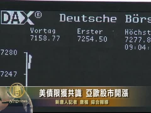 【新唐人2011年8月1日訊】美國兩黨與白宮取得舉債上限與縮減聯邦支出的共識,投資人暫時鬆口氣。星期一,歐股早盤告漲,亞股全面收漲,美國股市也均被看好開高。
