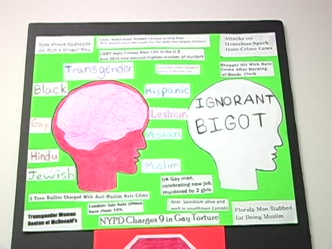 皇后區高中學生洪曉茵“這幅作品表現一名男孩躲在房間,他在學校受到種族歧視,他不敢告訴其他人,一天,他的家人和朋友敲開他的門,問他是否需要幫助。我覺得防止仇恨犯罪的最好方式,是受害人能向別人講出自己的遭遇。“