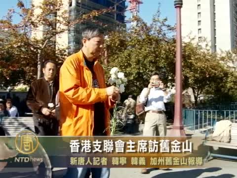 【新唐人2011年8月3日訊】八月一日,香港支聯會主席李卓人和副主席麥海華到達舊金山。一下飛機他們便趕往舊金山中國城花園角。向位於那裏的自由民主女神像獻花。請看報導。