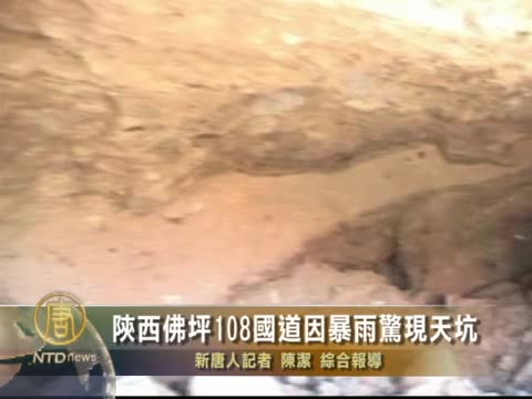 【新唐人2011年8月3日訊】8月1日中午,連日暴雨造成108國道陝西佛坪段出現巨大天坑,導致當地交通陷入癱瘓。