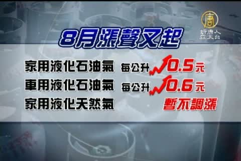 國際天然氣價格持續上揚,上個月家用天然氣每度調漲0.44元。8月份,桶裝瓦斯也跟著漲價。桶裝瓦斯每公升調漲0.5元,車用瓦斯每公升調漲0.6元