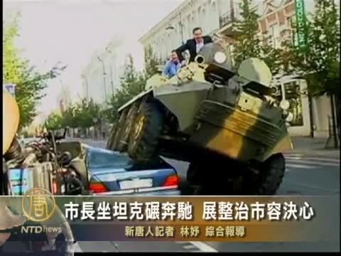 【新唐人2011年8月4日訊】立陶宛首都,維爾紐斯(Vilnius)市長,為了展示整治城市非法停車的決心,乘坐坦克車,碾壓了一輛非法停靠在自行車道的奔馳轎車,引來全球的矚目。