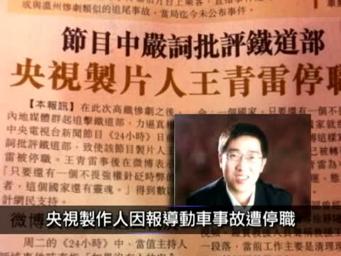 央視「新聞1+1」節目製作人王青雷,7月25日在節目中批評鐵道部一名發言人對事故調查的說法而被停職,事先沒有警告,也沒有任何解釋。「無國界記者組織」譴責當局限制媒體報導的做法。