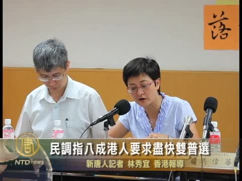【新唐人2011年8月5日訊】香港終極普選聯盟委託一間大學進行的民意調查顯示,近8成人贊成香港儘快實現行政長官及立法會全面普選,近7成贊成當局以"一次過立法"方式,制訂2017年和2020年普選特首及立法會的安排。
