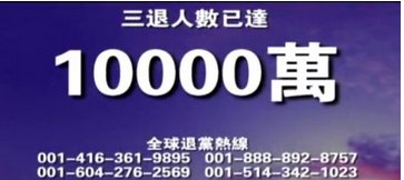 公開聲明退出中共黨、團、隊的「三退」人數,2005年4月21號突破100萬,2006年4月25號突破1000萬,2011年8月7號突破了一億人,並且每天以6萬左右的人數遞增。