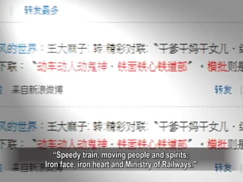 「乾爹乾媽乾女兒.紅樓紅歌紅十字」;「動車動人動鬼神.鐵面鐵心鐵道部」。橫批「無真相」。