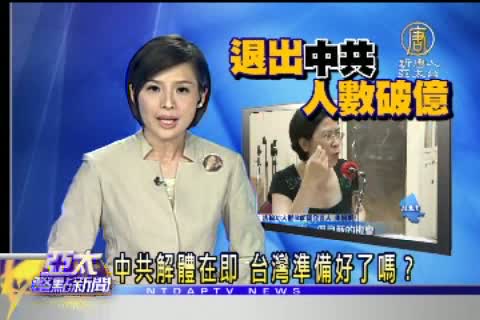 【新唐人亞太台2011年8月10日訊】中共建黨90年,在一派唱紅聲中,三退中共的人數已經破億。在這一場中國百年來最大規模的精神覺醒運動,法輪功在中國產生直接的影響。有很多中國人是因為了解法輪功受中共迫害的真相後自動的退離這個反人類的政權,更有無數的民眾在清醒後成為退黨志工,喚醒更多中國人。台灣關懷中國人權聯盟理事長楊憲宏日前參與法輪功和平反迫害12年活動時,對台灣朝野提出呼籲,應該為法輪功受迫害說出公道話,兩岸交流才有意義。 他嚴肅的提問:在面對中共解體在即的此刻,台灣準備好了嗎?