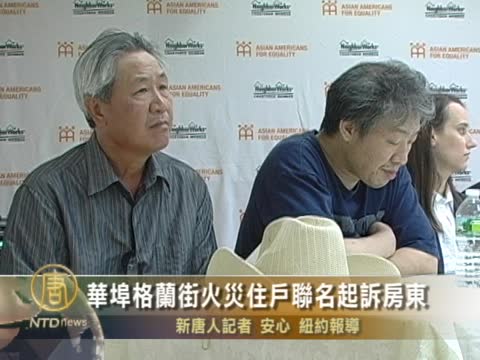 【新唐人2011年8月11日訊】紐約華埠格蘭街283和285號兩棟大樓在一年前的一場大火中被毀,數十住戶的財產付之一炬。事隔一年,27戶受災家庭,聯名狀告房東維護大樓電力和防火系統不當,要求賠償財產損失和安置費兩百萬元。請看報導。