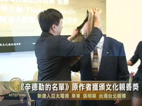 【新唐人2011年8月11日訊】澳洲當代知名作家、電影《辛德勒的名單》原著小說 作者湯瑪士·肯納利受邀來臺參加國家大師人文講座。文建會目前正積極籌辦國家人權博物館,藉這次肯納利來臺,頒發文化親善獎章,表揚他在宣揚人權道德及文學的貢獻。