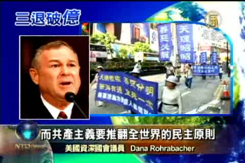 【新唐人亞太台2011年8月12日訊】在海內外,聲明退出中共黨、團、隊組織的人數已經突破一億。對此,美國資深國會議員羅拉巴克認為,退黨引發了中國民眾的精神覺醒。作為美國這樣的民主政府,應該給予大力支持。