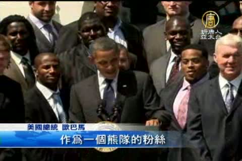 【新唐人亞太台2011年8月13日訊】星期五,美國總統歐巴馬在白宮接待美國橄欖球超級盃冠軍隊,綠灣包裝工隊。歐巴馬不改幽默本性, 讓現場氣氛輕鬆有趣。